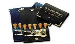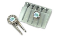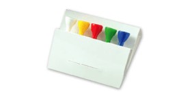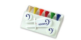 Printed White Card Wallet containing six wooden tees, one plastic